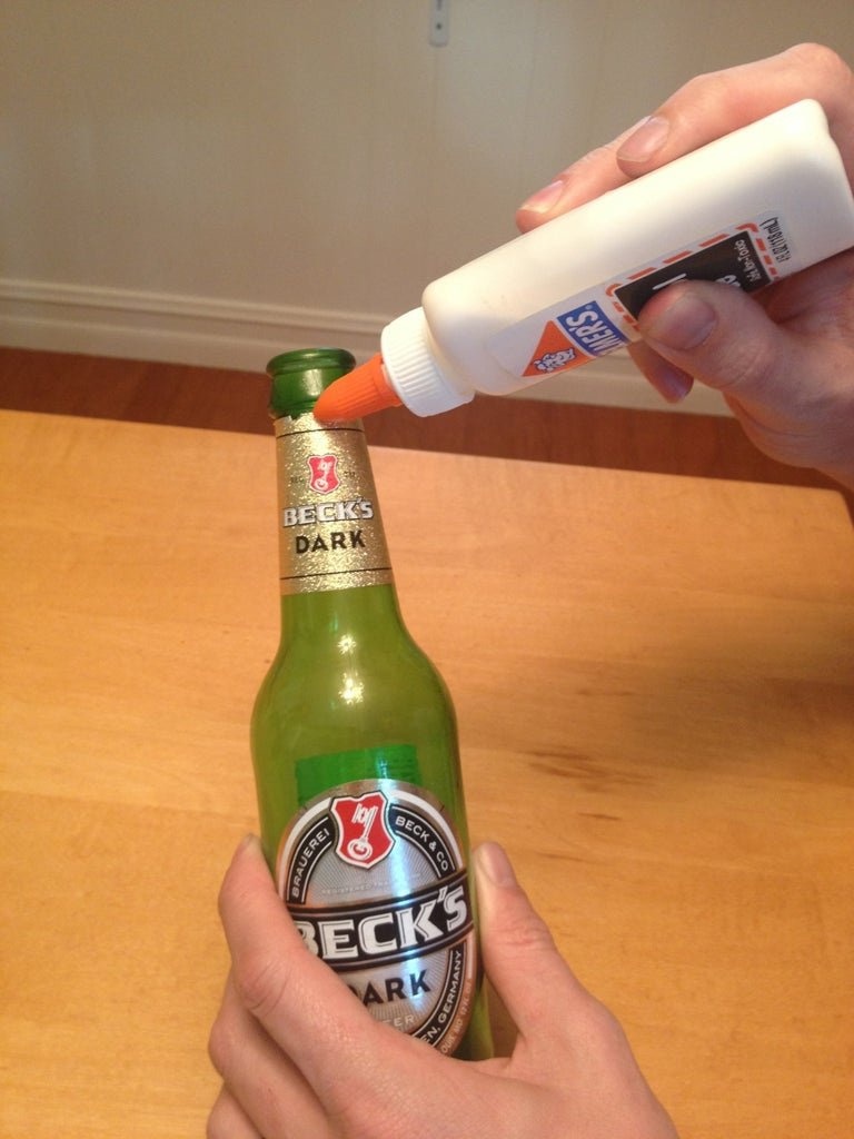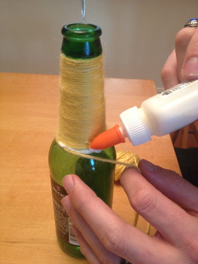 Завершающий этап - возможность добавить дополнительные штрихи. Если горлышко емкости изначально имеет резьбу для колпачка, то можно украсить ее шпагатом, который фиксируется клеем. Второй вариант проще: с помощью глиттера. Сверху горлышка и на отдельные участки бутылки (например, вокруг изображения) нужно нанести виниловый клей, затем обильно посыпать блестками, стряхивая лишние блестки. Дайте высохнуть, и ваза готова.