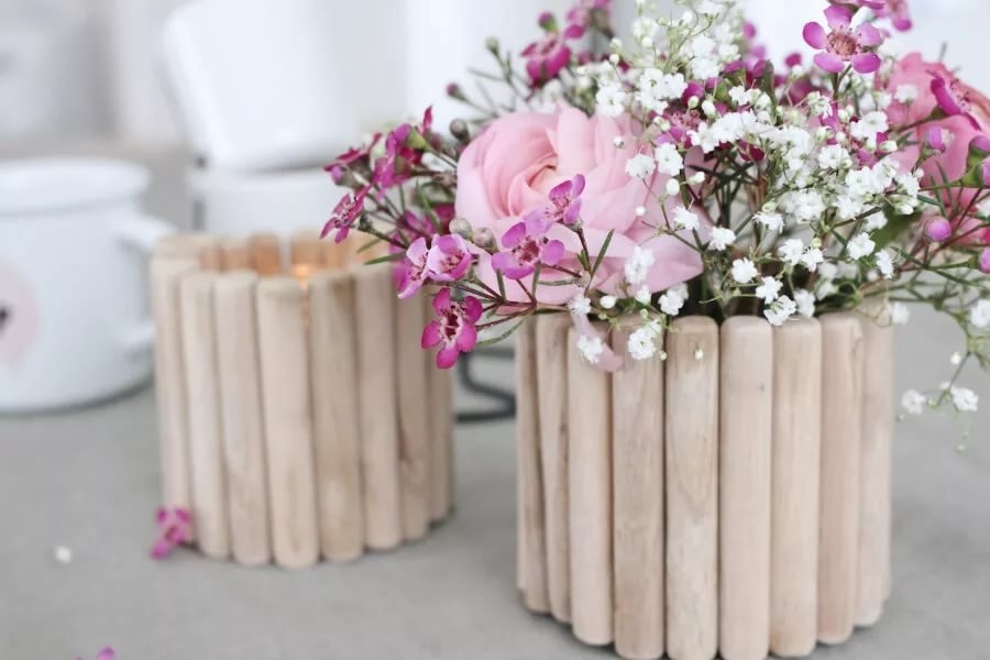Дизайн вазы не обязательно сочетать с определенными цветами, ведь предметы интерьера часто используются как украшения. Именно поэтому важно сделать акцент на оригинальности, используя для украшения поверхности материалы, которые изначально для этого не предназначались: