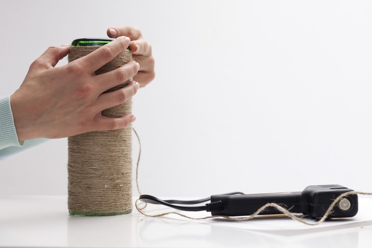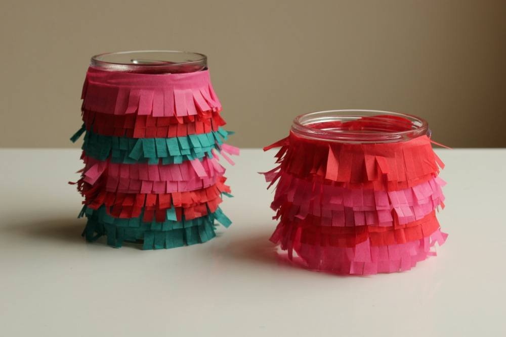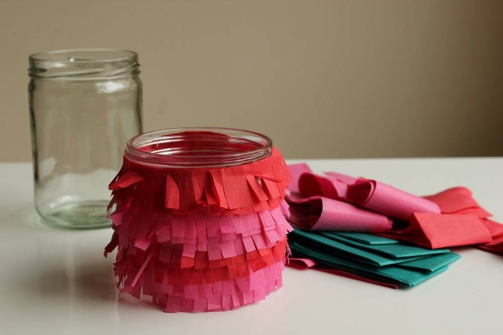 Используйте монтажный клей или клеевой пистолет, чтобы закрепить материал. Такой закрепитель не смывается водой и надежно приклеит ткань к поверхности банки. Во время работы плотно прижмите ткань к стеклянной или пластиковой посуде, иначе она соскользнет после высыхания.