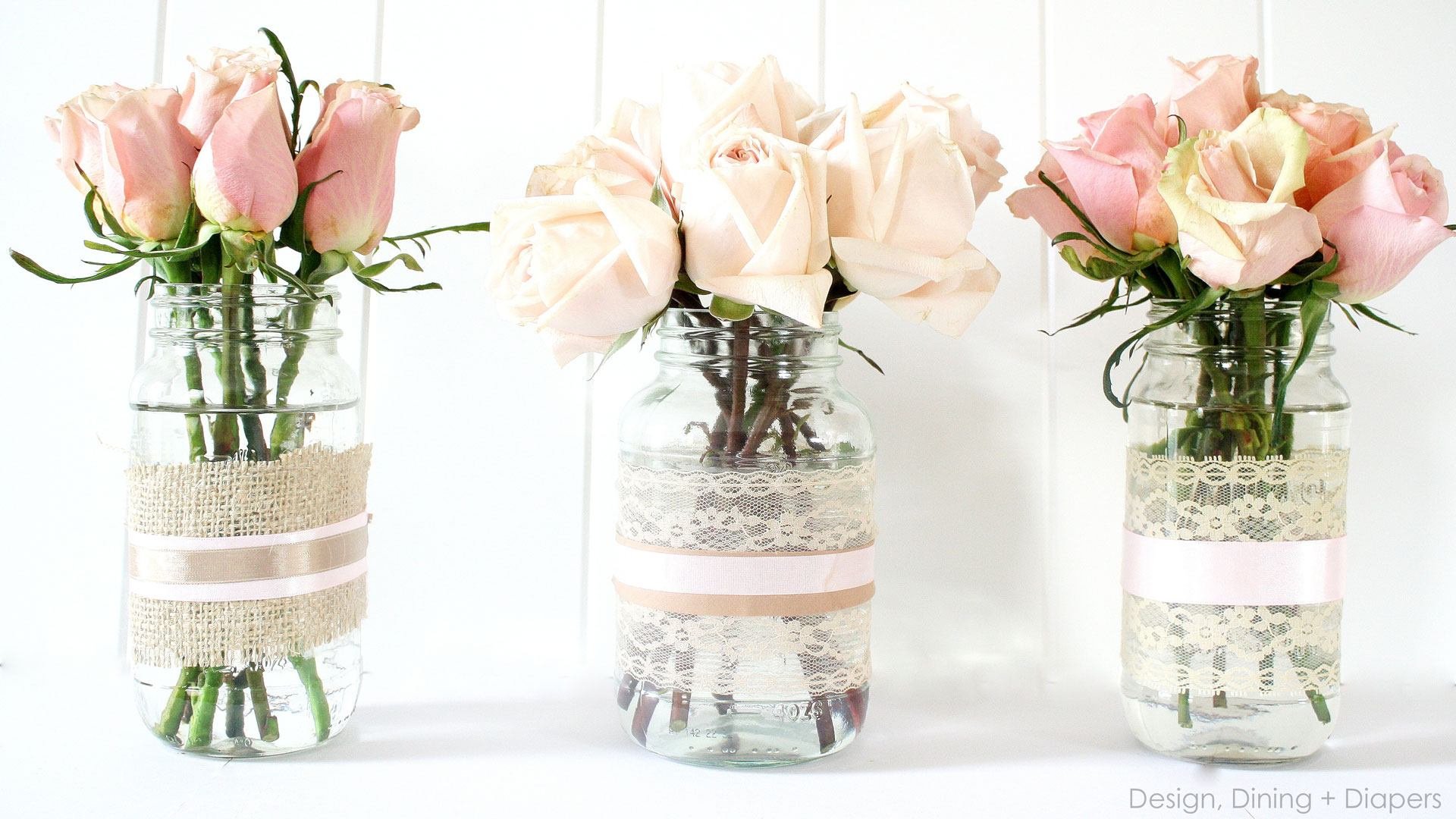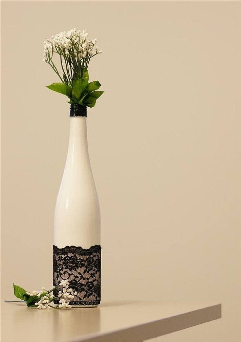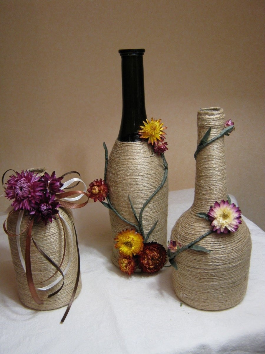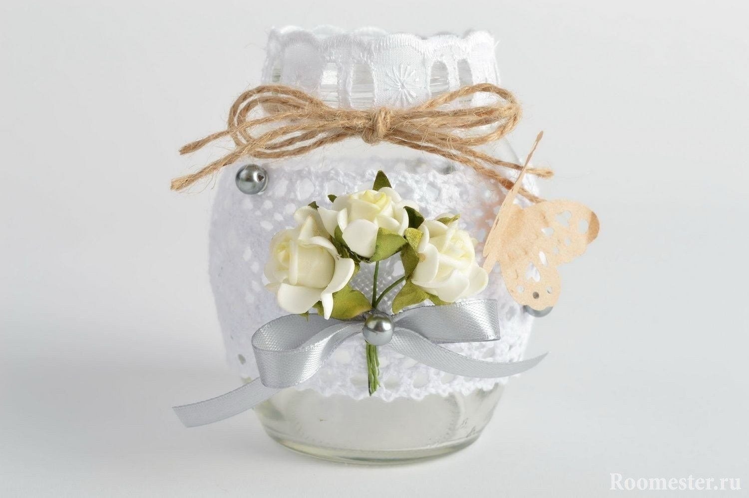 Очень нежно смотрятся вазы, украшенные кружевом, кроме того, в них используются кусочки шпагата, завязывающие узлы или бантики.