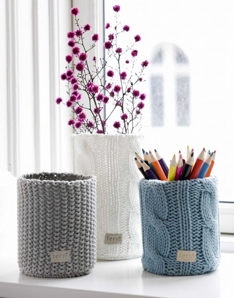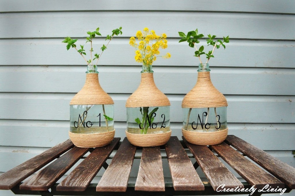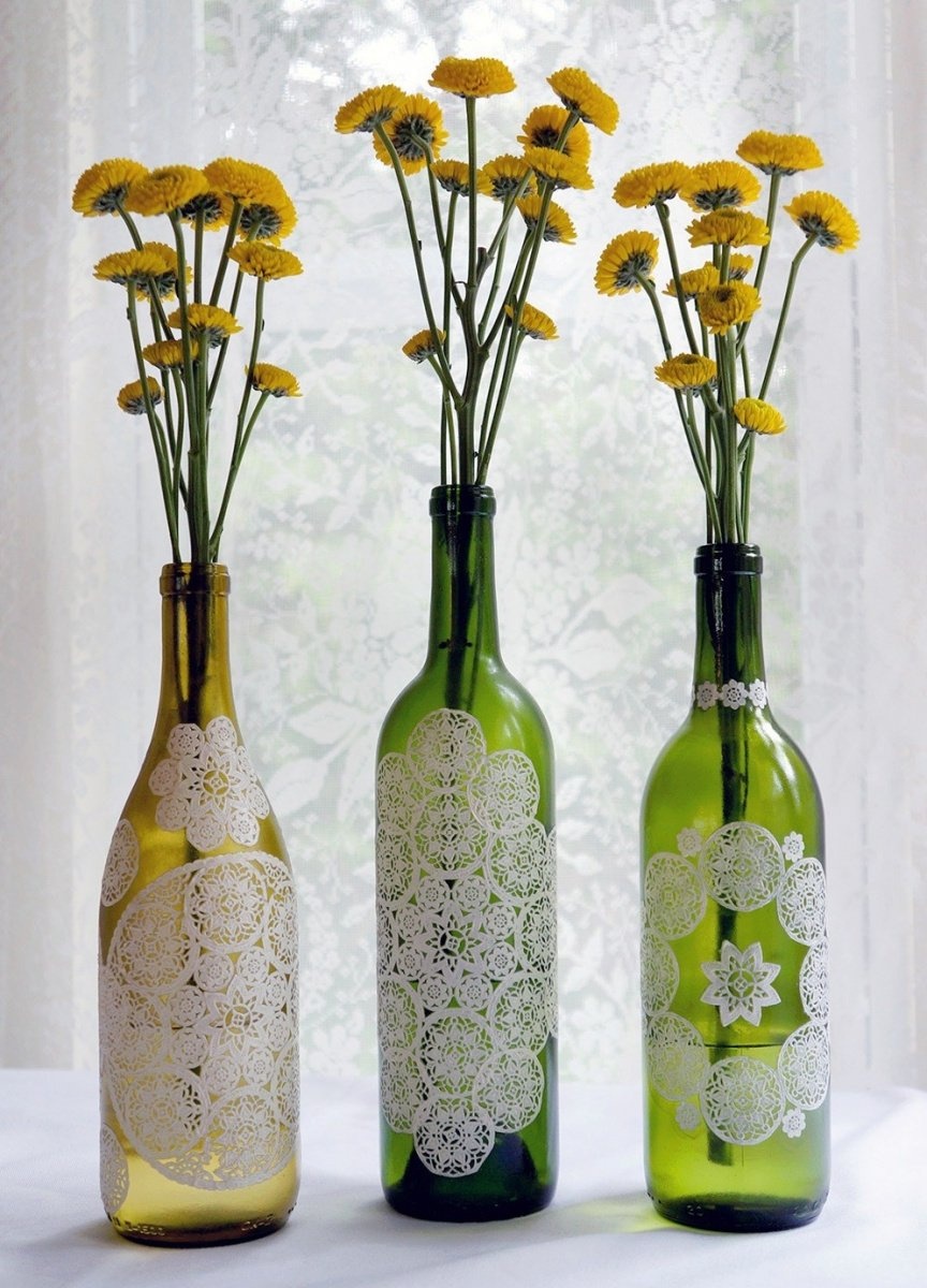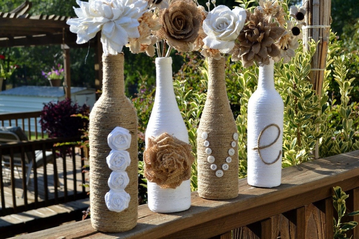 Очень нежно смотрятся вазы, украшенные кружевом, кроме того, в них используются кусочки шпагата, завязывающие узлы или бантики.
