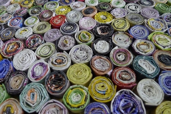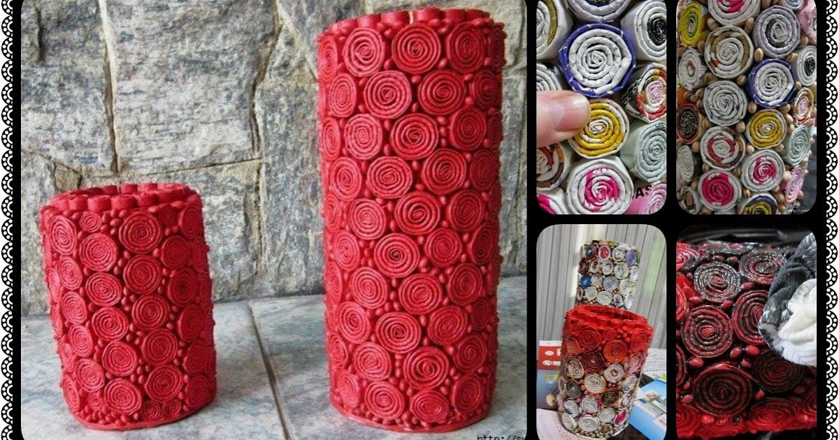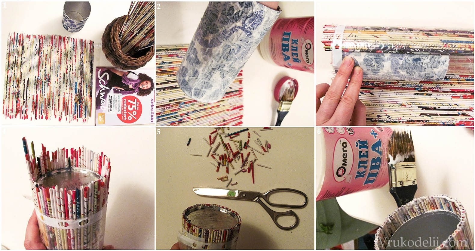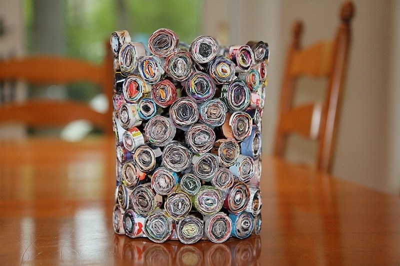 Теперь начинается самая кропотливая работа - создание украшений для бумажной вазы. Нарежьте старые газеты на полоски, сложите их пополам и скатайте в рулоны. Закрепите концы бумаги суперклеем или виниловым клеем. Готовые украшения приклейте к поверхности картонной трубки с помощью клея ПВА, плотно уложив их друг на друга.