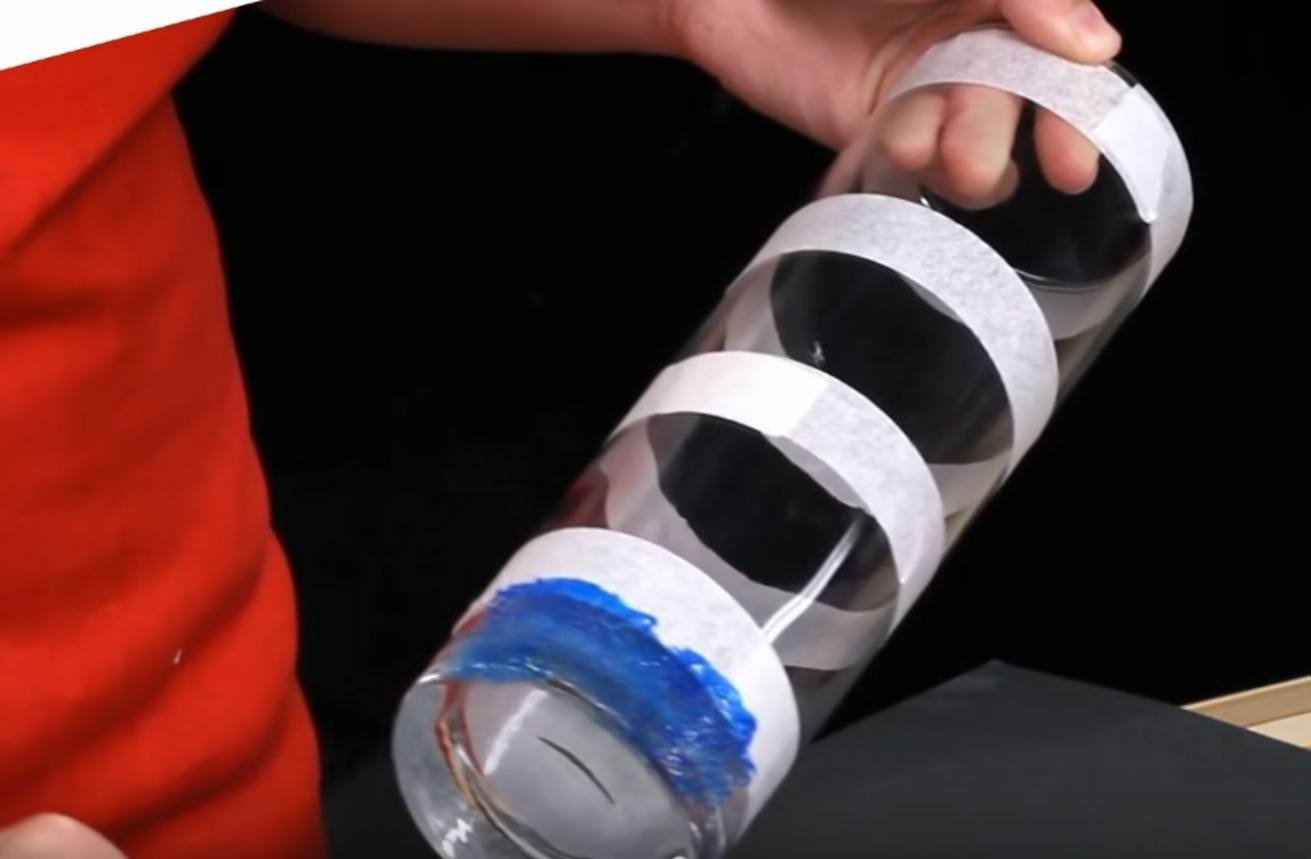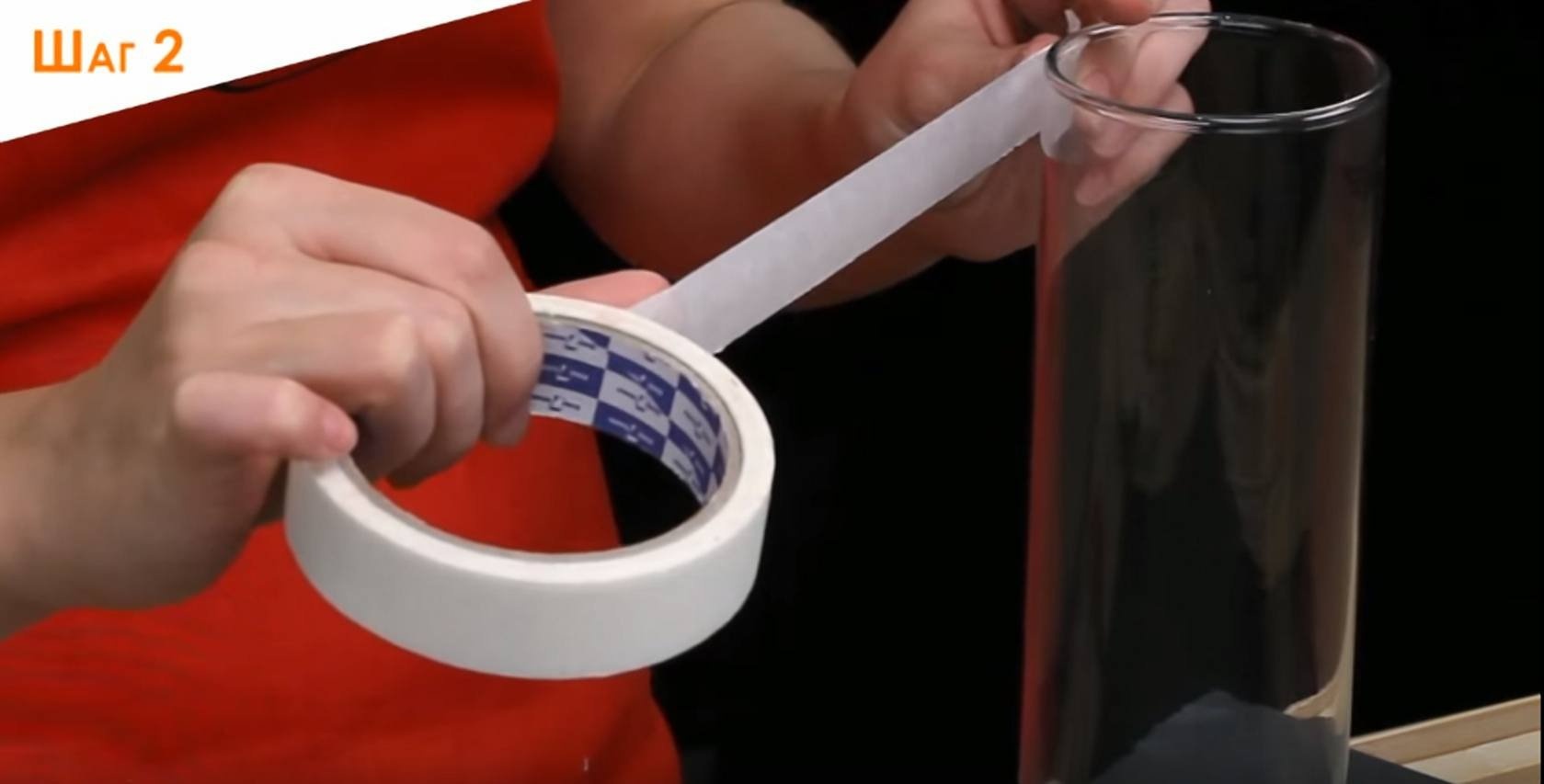 2. С помощью строительного скотча диаметром от 3 до 5 сантиметров нанесите на поверхность вазы абстрактные полосы. Они могут быть абсолютно плоскими или располагаться по диагонали.