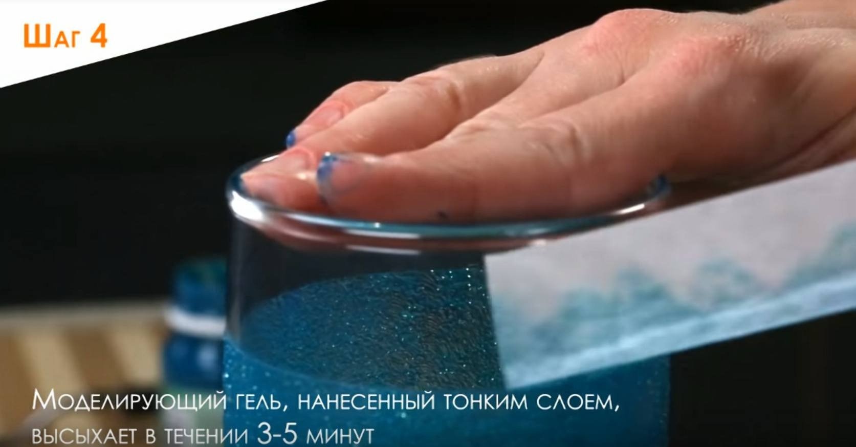 3. Нанесите акриловую краску или моделировочный гель на удобную поверхность, добавив немного блесток. С помощью губки нанесите гель на поверхность банки.