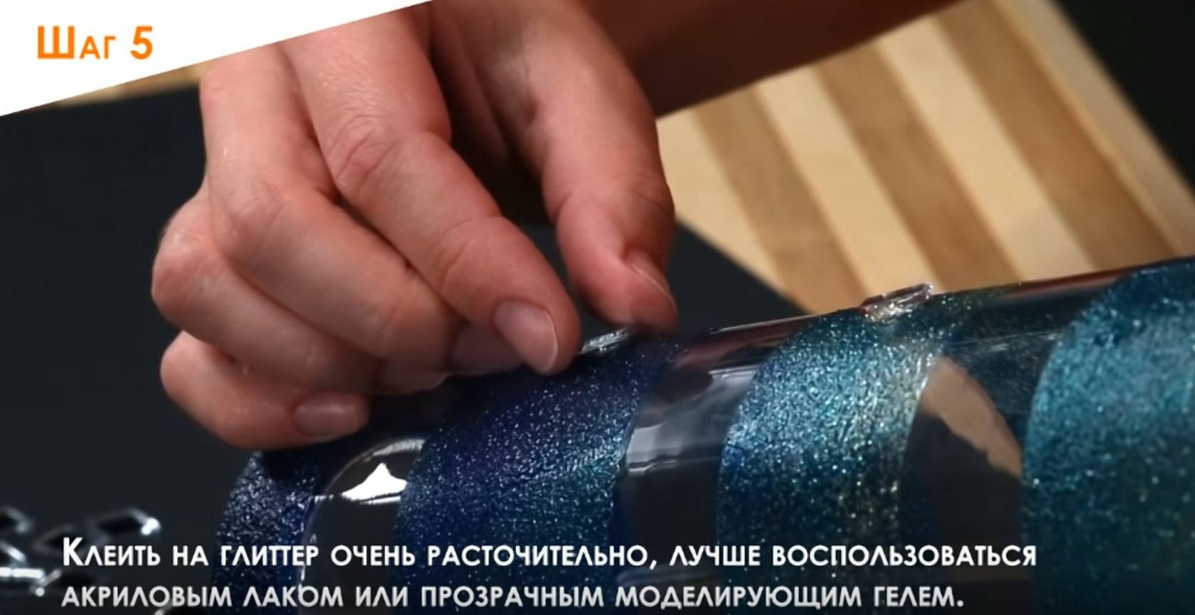 На этом украшение вазы глиттером и моделирующим гелем можно считать завершенным. При желании можно покрыть готовую вазу верхним слоем прозрачного или гель-лака, что сделает цвета более насыщенными и яркими.