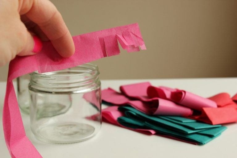 Чтобы задрапировать стеклянную поверхность, украсьте ее потертыми бумажными полосками. Можно использовать несколько похожих оттенков или, наоборот, создать разноцветный микс из нескольких противоположных цветов. Приклейте подготовленные цветы и листики к основе.